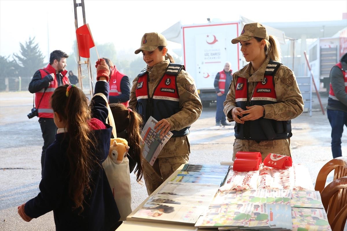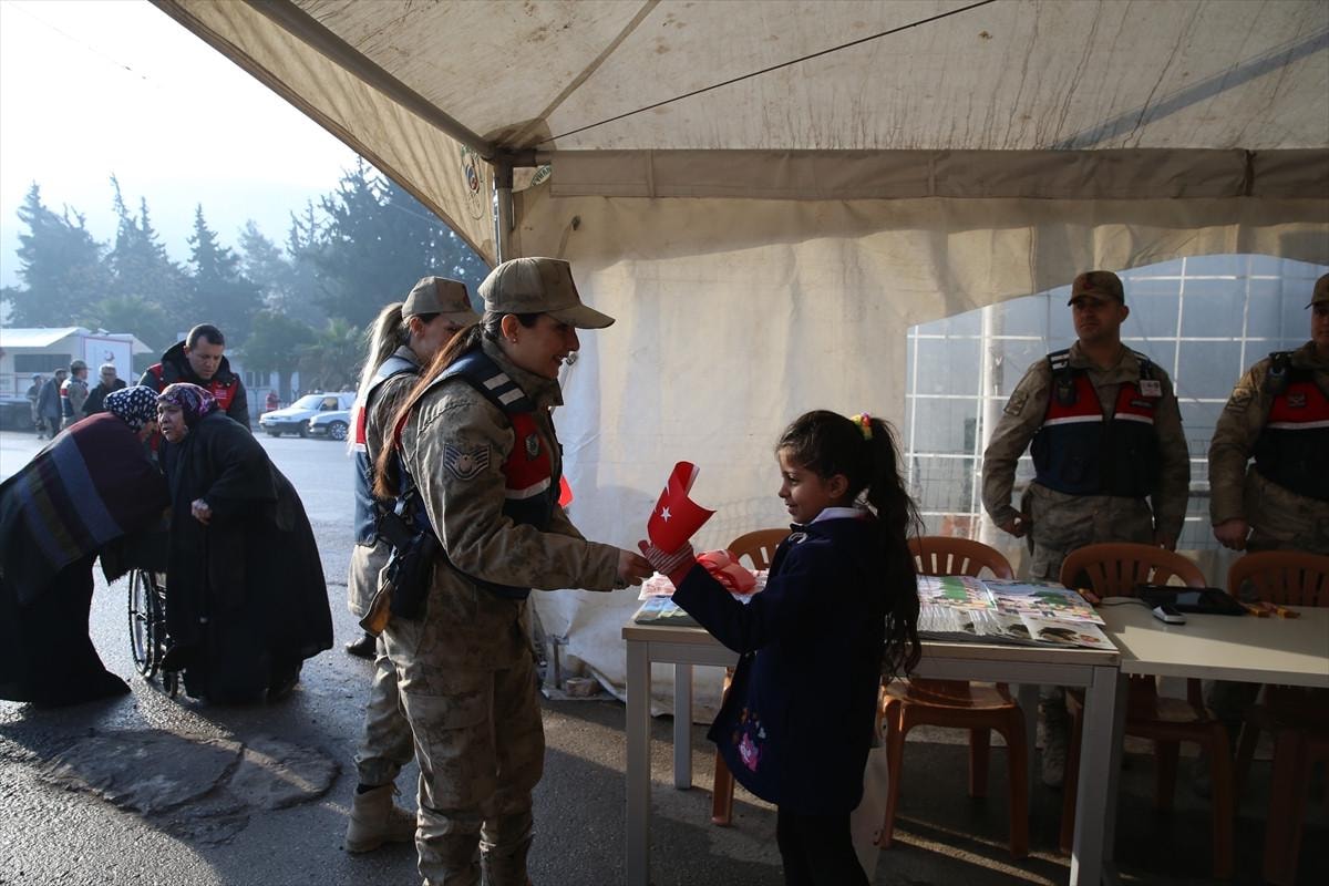 Öte yandan jandarma ve İl Göç İdaresi Müdürlüğü ekipleri, Suriyeli çocuklara Türk bayrağı, boyama kitabı ve oyuncak gibi hediyeler veriyor.