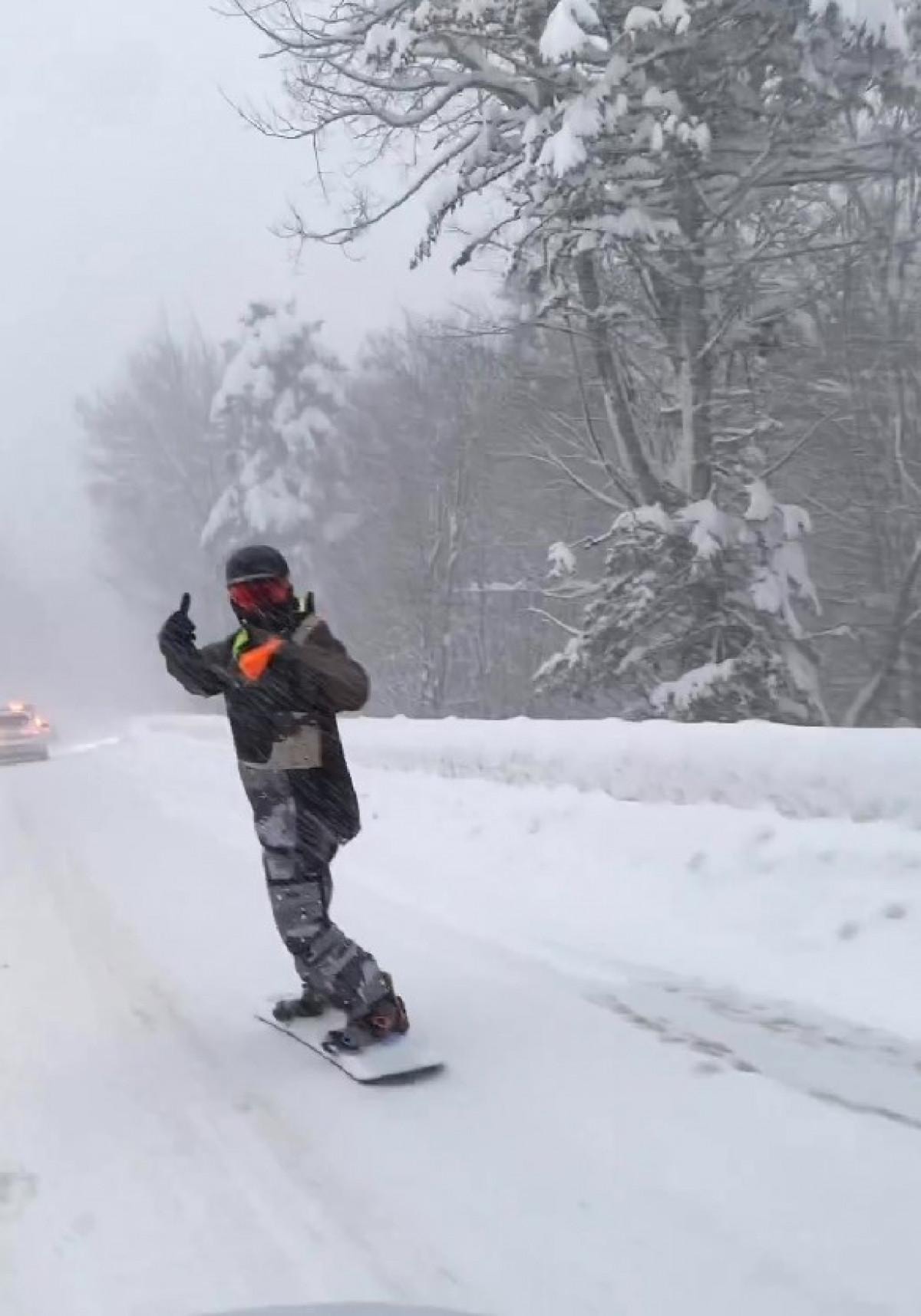 Bir kayaksever , trafiğe takılmamak için snowboard yaptı