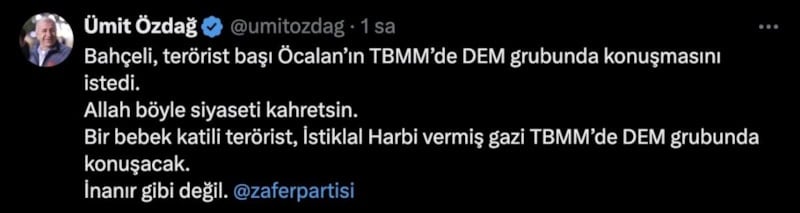 X hesabından Bahçeli'nin sözlerini paylaşan Özdağ, "Bahçeli, terörist başı Öcalan’ın TBMM’de DEM grubunda konuşmasını istedi. Allah böyle siyaseti kahretsin. Bir bebek katili terörist, İstiklal Harbi vermiş gazi TBMM’de DEM grubunda konuşacak. İnanılır gibi değil." ifadelerini kullandı.