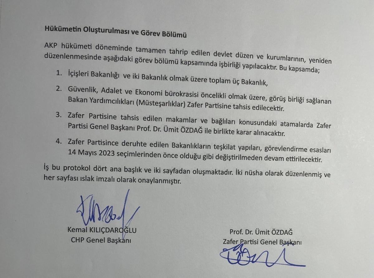 Protokole göre Kemal Kılıçdaroğlu'nun, Özdağ'a üç bakanlık verdiği gözler önüne serildi.