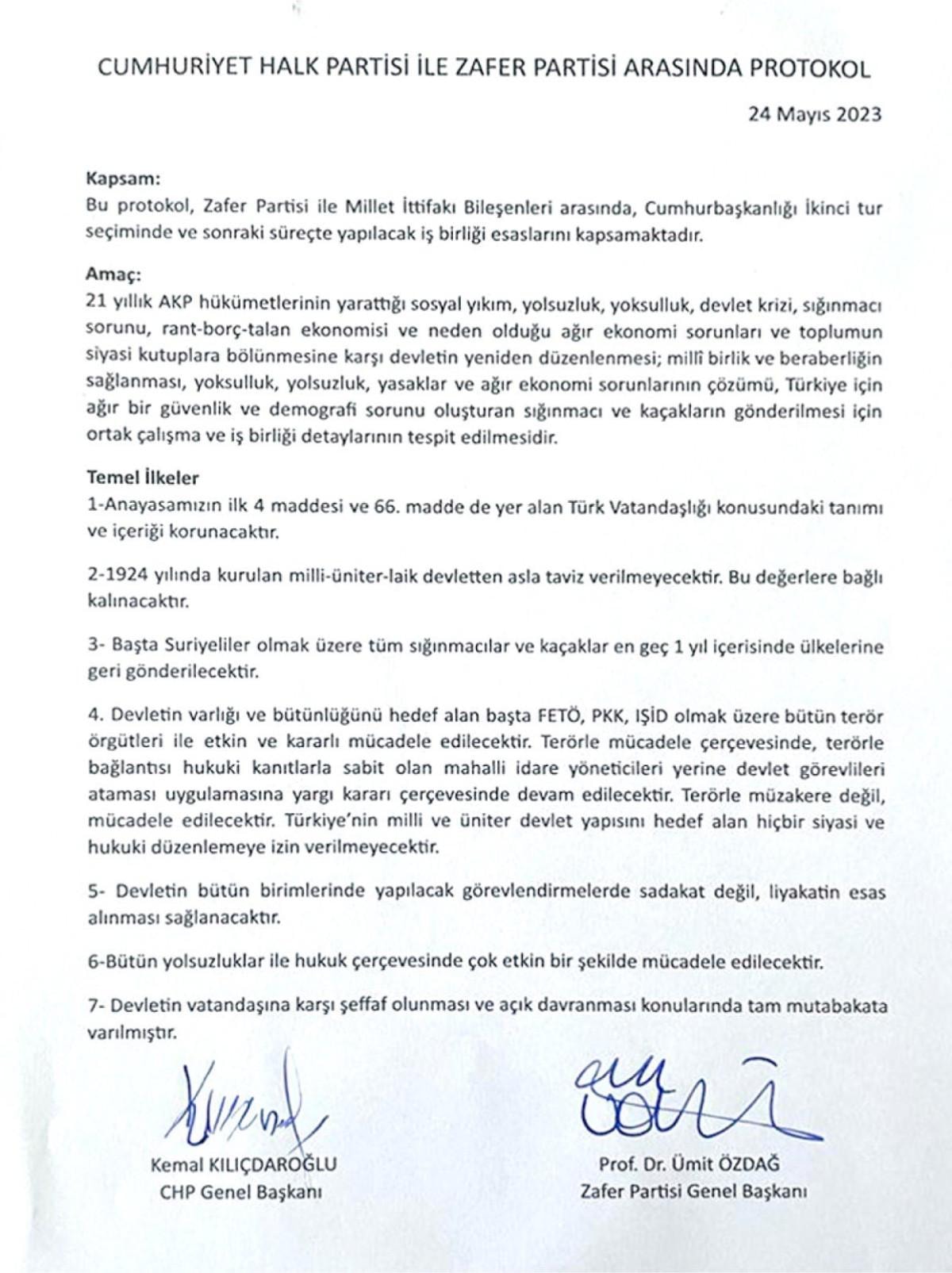Zafer Partisi Ümit Özdağ ile Kemal Kılıçdaroğlu, gizli tutulan protokol kapsamında imzaları attı.