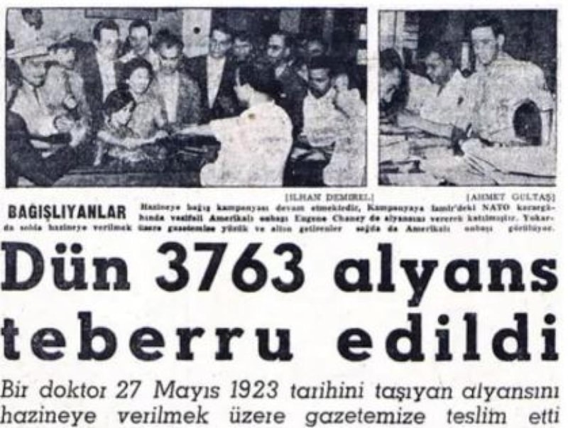 27 Mayıs 1960 kanlı darbesini yapan cunta ise dönemin basınının yayınlarının da yardımıyla, “Demokrat Parti Hükümeti’nin Hazine’yi boşalttığını, elde altın kalmadığını” ileri sürerek, halka alyansları ve diğer altın yüzükleri ile mücevherlerini bağışlaması çağrısı yapmıştı. Başlatılan “alyans kampanyası”yla TSK’nın silah ve mühimmat ihtiyacının karşılanacağı iddia edilmekteydi.