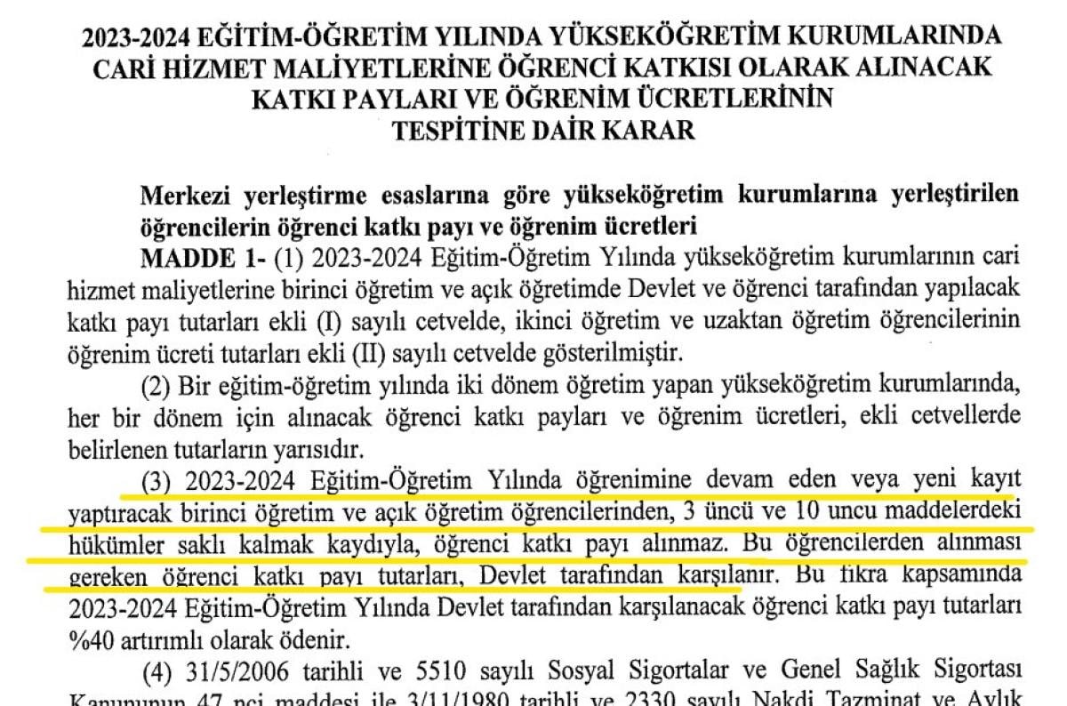 Birinci öğretim programına kayıtlı olan öğrencilerin ödemeleri gereken ücretler, devlet tarafından karşılanmaya devam edilecek.