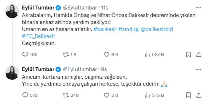 Oyuncu Eylül Tumbar, Balıkesir'in Sındırgı ilçesinde meydana gelen 6.1 büyüklüğündeki depremde amcasını kaybetti. Tumbar, sosyal medya hesabından yaptığı paylaşımda, "Amcamı kurtaramamışlar, başımızı sağ olsun" ifadelerini kullandı.
