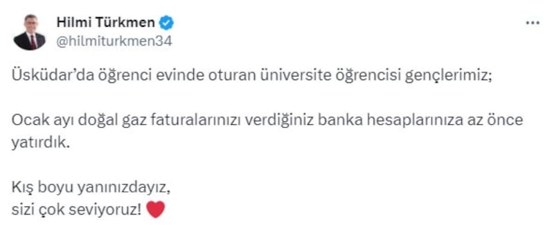Öğrenci evinde yaşayan gençlere doğalgaz desteği veren Üsküdar Belediye Başkanı Hilmi Türkmen, yaptığı son paylaşımda ocak ayı doğalgaz faturalarının hesaba yatırıldığını belirtti.