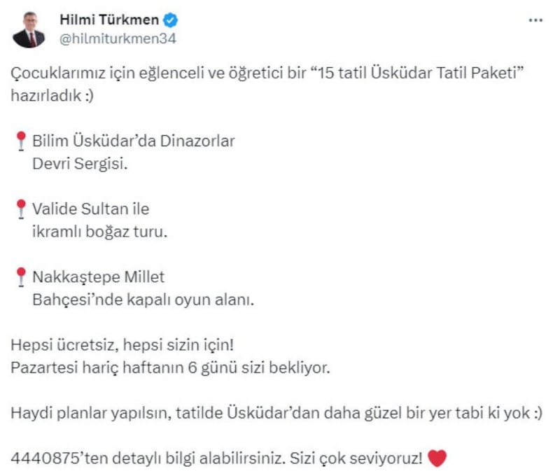 Türkmen, sosyal medya hesabından projeyi, "15 tatil Üsküdar Tatil Paketi” notuyla duyurdu.
