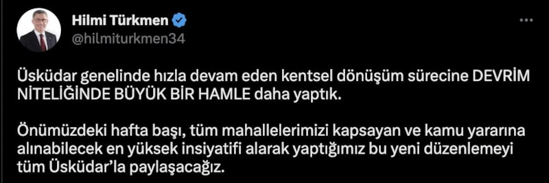 Duyuruyu Üsküdar Belediye Başkanı Hilmi Türkmen, Twitter hesabından yaptı.
