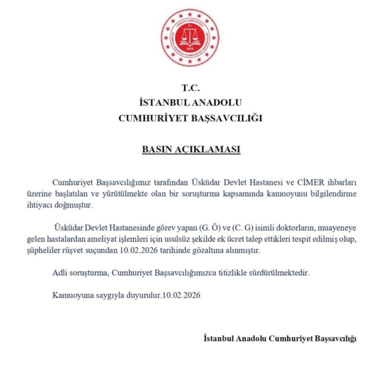 Üsküdar Devlet Hastanesi’nde görev yapan G. Ö. ve C. G. isimli doktorların, muayeneye gelen hastalardan ameliyat işlemleri için usulsüz şekilde ek ücret talep ettikleri tespit edilmiş olup, şüpheliler rüşvet suçundan 10.02.2026 tarihinde gözaltına alınmıştır.