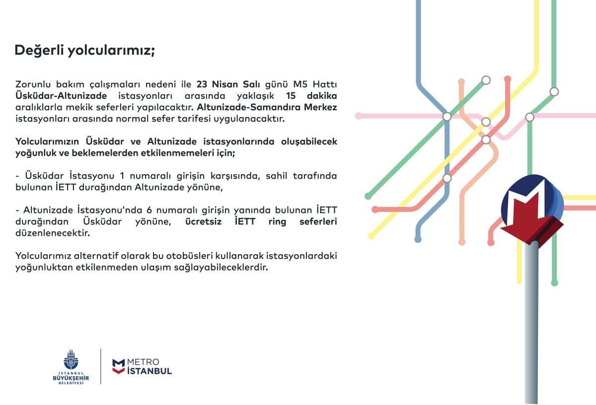 "Zorunlu bakım çalışmaları nedeni ile 23 Nisan Salı günü M5 Hattı Üsküdar-Altunizade istasyonları arasında yaklaşık 15 dakika aralıklarla mekik seferleri yapılacaktır. Altunizade-Samandıra Merkez istasyonları arasında normal sefer tarifesi uygulanacaktır.