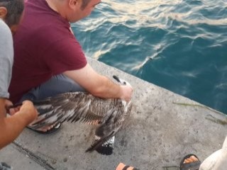 Kendisini kurtarmak isteyen vatandaşları ısıran martı, misinadan kurtulunca hızla uzaklaştı. Martıyı görünce şaşkına dönen amatör balıkçı, "Çapari yapıyordum, şansıma oltama martı geldi" dedi.