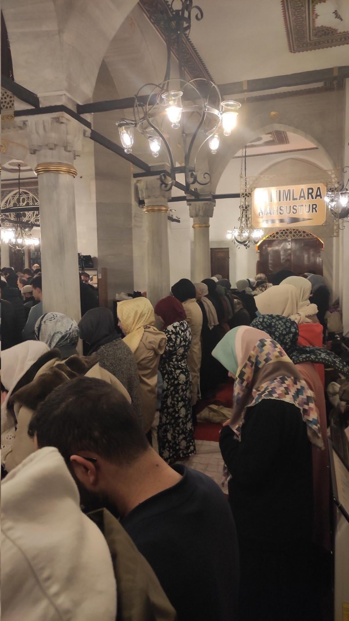 Bu yoğunluğun yaşandığı yerlerden biri olan Üsküdar'daki Valide-i Cedid Camii'inde vatandaşlar, saflarda yer bulabilmek için erkek kadın karışık bir şekilde namaza durdu.