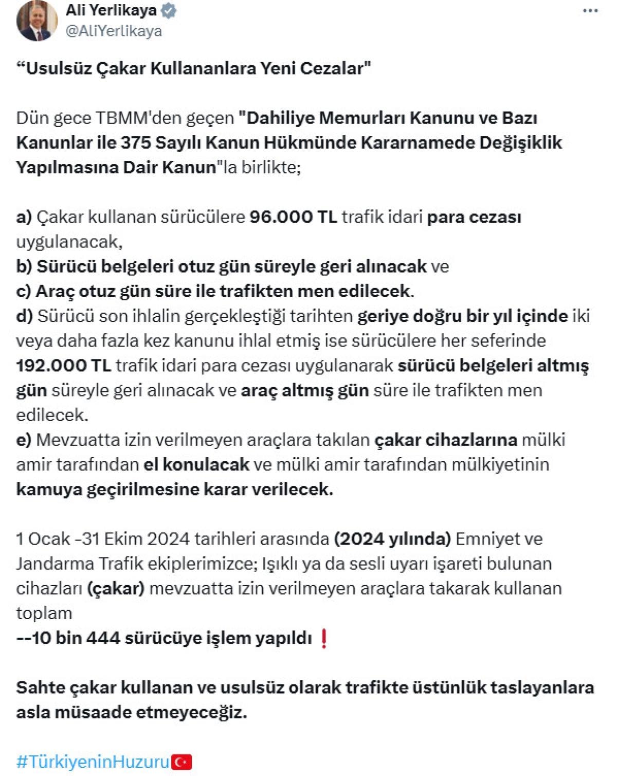 Ayrıca 2024 yılı 1 Ocak-31 Ekim tarihleri arasında araçlarına mevzuata aykırı çakar takan 10 bin 444 sürücüye işlem yapıldığını da açıklayan Bakan Yerlikaya, şu ifadeleri kullandı: