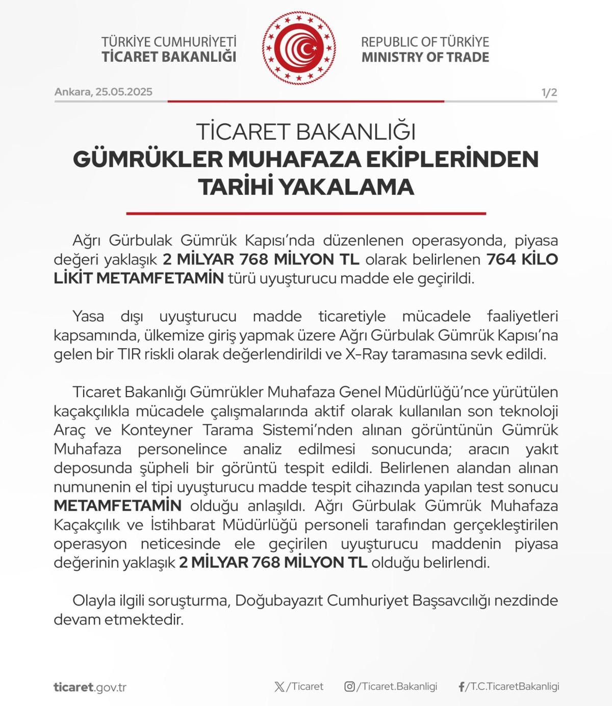 Ağrı Gürbulak Gümrük Muhafaza Kaçakçılık ve İstihbarat Müdürlüğü personeli tarafından gerçekleştirilen operasyonda, piyasa değeri yaklaşık 2 milyar 768 milyon TL olarak belirlenen 764 kilo likit metamfetamin türü uyuşturucu madde ele geçirildi.