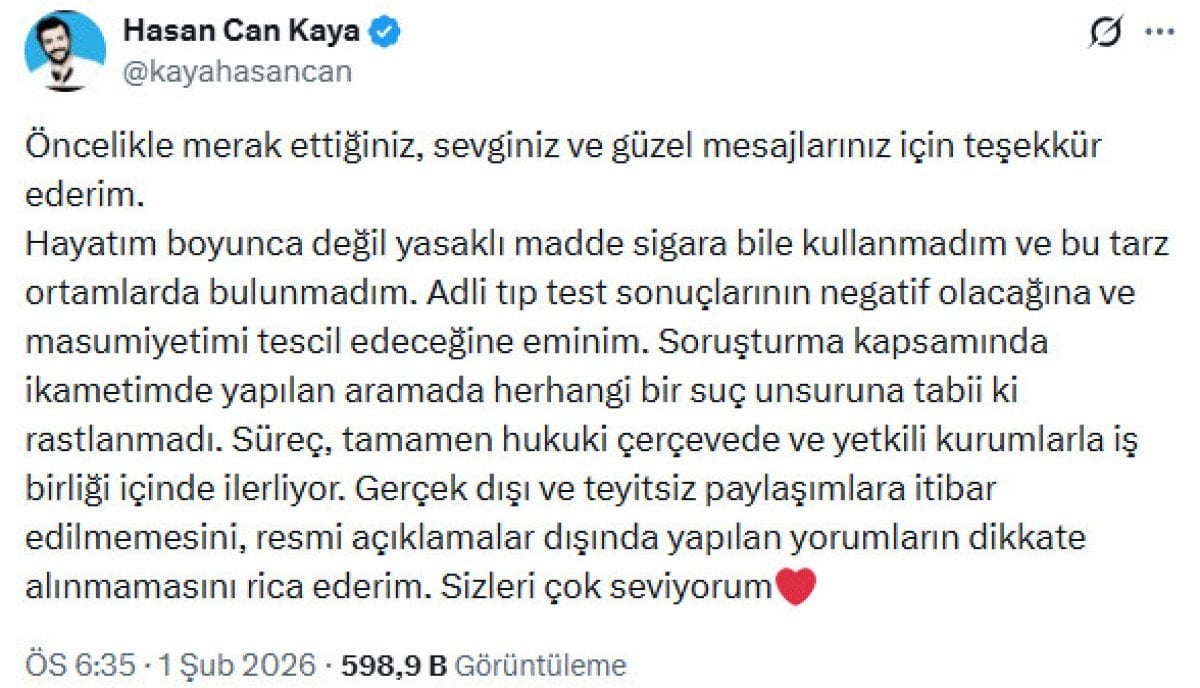 Hayatım boyunca değil yasaklı madde sigara bile kullanmadım ve bu tarz ortamlarda bulunmadım. Adli tıp test sonuçlarının negatif olacağına ve masumiyetimi tescil edeceğine eminim. Soruşturma kapsamında ikametimde yapılan aramada herhangi bir suç unsuruna tabii ki rastlanmadı. Süreç, tamamen hukuki çerçevede ve yetkili kurumlarla iş birliği içinde ilerliyor.