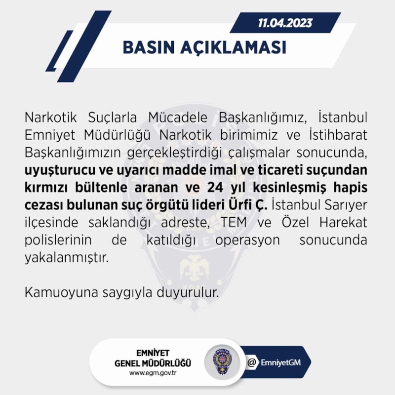 Narkotik Suçlarla Mücadele Başkanlığımız, İstanbul Emniyet Müdürlüğü Narkotik birimimiz ve İstihbarat Başkanlığımızın gerçekleştirdiği çalışmalar sonucunda, uyuşturucu ve uyarıcı madde imal ve ticareti suçundan kırmızı bültenle aranan ve 24 yıl kesinleşmiş hapis cezası bulunan suç örgütü lideri Ürfi Ç. İstanbul Sarıyer ilçesinde saklandığı adreste, TEM ve Özel Harekat polislerinin de katıldığı operasyon sonucunda yakalanmıştır. Kamuoyuna saygıyla duyurulur.