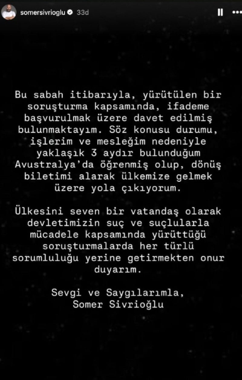 Bu sabah itibarıyla, yürütülen bir soruşturma kapsamında, ifademe başvurulmak üzere davet edilmiş bulunmaktayım. Söz konusu durumu, işlerim ve mesleğim nedeniyle yaklaşık 3 aydır bulunduğum Avustralya’da öğrenmiş olup, dönüş biletimi alarak ülkemize gelmek üzere yola çıkıyorum.