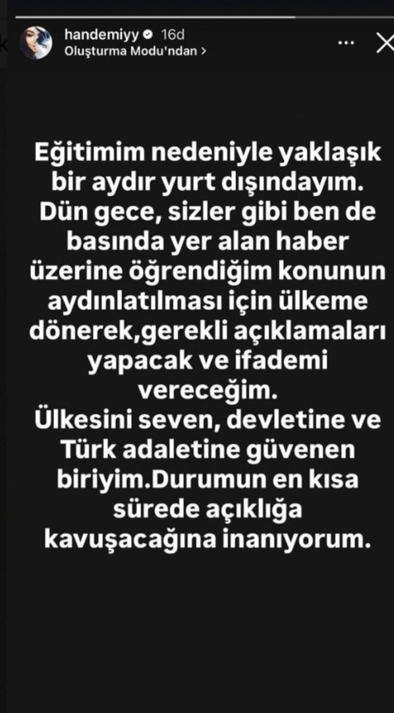 Ünlülere yönelik uyuşturucu soruşturması kapsamında hakkında yakalama kararı bulunan ünlü oyuncu Hande Erçel'den ilk açıklama geldi. Erçel, eğitimi için yurt dışında olduğunu söyledi.