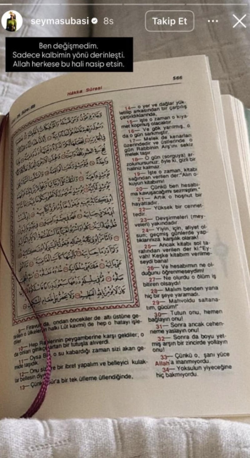 Şeyma Subaşı bu paylaşımın ardından ise Kur'an-ı Kerim paylaşarak sosyal medyada gündeme geldi.