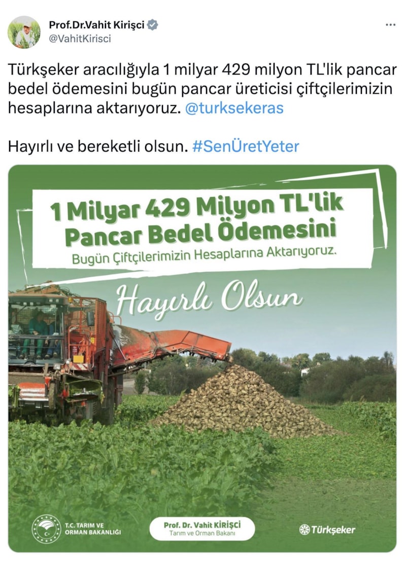 Tarım ve Orman Bakanı Vahit Kirişci, Twitter hesabı üzerinden yayınladığı mesajında bugün yapılan pancar ödemesinin detaylarını paylaştı.