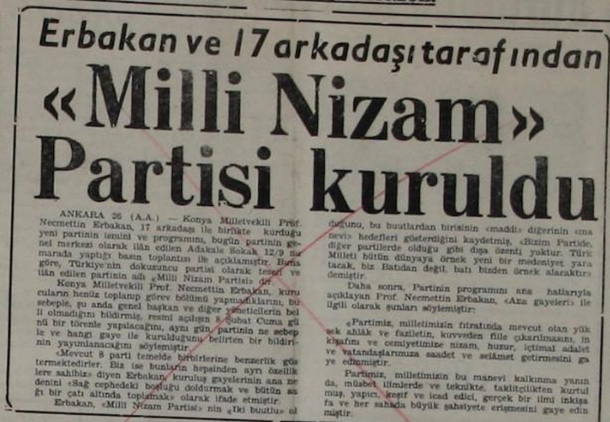 Necmettin Erbakan’ın MNP’nin kurulduğu gün yaptığı konuşmadaki, “Açıkça ilan ediyorum ki, bizim partimizin kurucuları Sultan Fatih Hazretleri, Sultan Yıldırım Hazretleri, Sultan Murat, Sultan Melikşah, Ulubatlı Hasan, Orhan Gazi, Nizamülmülk, Akşemseddin, Sultan Yavuz, Kılıçarslan, Alp Arslan, Gelenbevi Hazretleri ve Sultan Hamit’dir.” sözleri başta olmak üzere, “Yarabbi Milli Nizamı, evliyaların duasındaki idarenin bu memlekete gelmesine vesile kıl, amin”, “Başörtülü öğretmenler işlerinden atılıyor. Milli Nizam buna son verecek.”, “Çocuklarımıza din eğitimi verilmiyor, bunu değiştireceğiz.” gibi daha pek çok konuşması “laikliğe aykırı” bulunarak partisi hakkında kapatma davası açılmıştı. Davayı Cumhuriyet Başsavcılığı açmış, kapatma kararını (20 Mayıs 1971) ise Anayasa Mahkemesi vermişti.