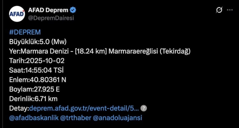 AFAD'dan yapılan açıklamaya göre deprem Marmara Denizi'nde Marmaraereğlisi-Tekirdağ açıklarında 5.0 büyüklüğünde gerçekleşti.