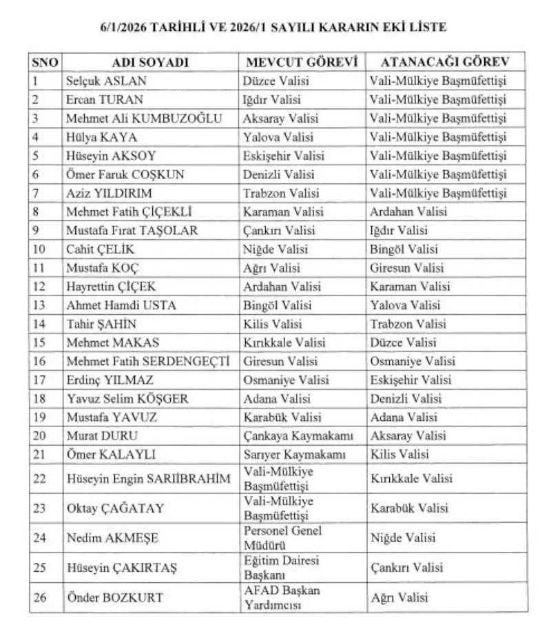 Cumhurbaşkanı Recep Tayyip Erdoğan’ın imzasıyla Resmî Gazete’de yayımlanan 6 Ocak 2026 tarihli ve 2026/1 sayılı kararnameye göre; Düzce Valisi Selçuk Aslan, Iğdır Valisi Ercan Turan, Aksaray Valisi Mehmet Ali Kumbuzoğlu, Yalova Valisi Hülya Kaya, Eskşehir Valisi Hüseyin Aksoy, Denizli Valisi Ömer Faruk Coşkun ve Trabzon Valisi Aziz Yıldırım vali-mülkiye başmüfettişliği görevine getirildi.