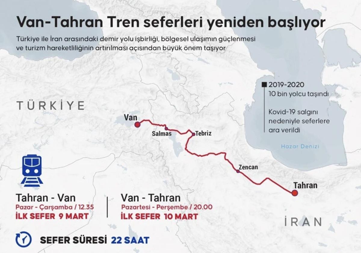 Tahran-Van Yolcu Treni pazar ve çarşamba Tahran'dan 12.35'te, Van'dan ise pazartesi ve perşembe saat 20.00'de hareket edecek. Yolcularımız, 22 saatlik keyifli bir seyahati demir yolu konforunda gerçekleştirecekler. Biletler ise 25 Şubat Salı günü satışa sunulacak. İlk sefer Tahran'dan 9 Mart'ta, Van'dan ise 10 Mart'ta gerçekleşecek.