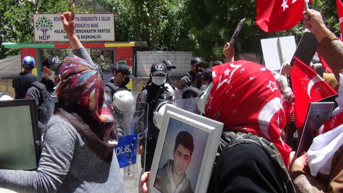 Bina önüne gelen aileler, “Kahrolsun PKK, iş birlikçi HDP” sloganı atarken, HDP'liler ailelerin seslerini bastırmak için yüksek sesle müzik çaldı. Aileler, çalınan müziğe ellerindeki Türk bayrakları ve çocuklarının fotoğraflarını kaldırarak tepki gösterdi.