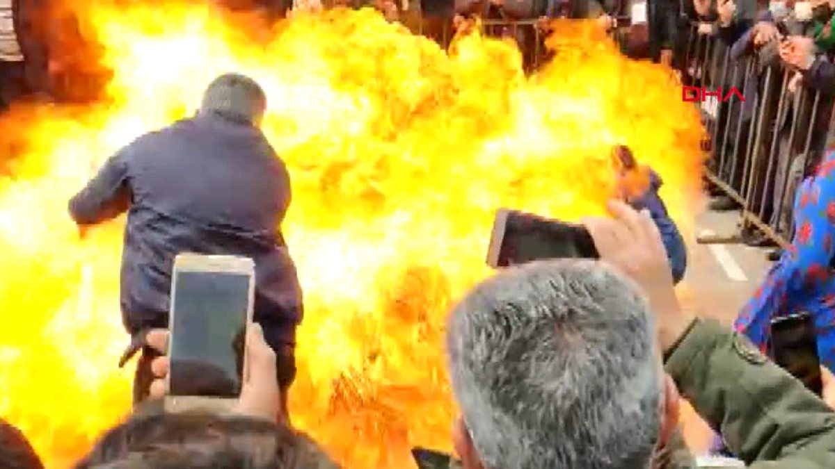 Saçları tutuşan kadına çevredekilere müdahale ederken, teröristbaşı Abdullah Öcalan için atılan "Biji serok Apo" sloganları dikkat çekti.