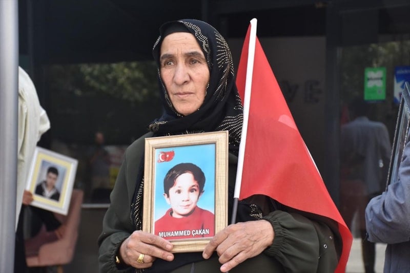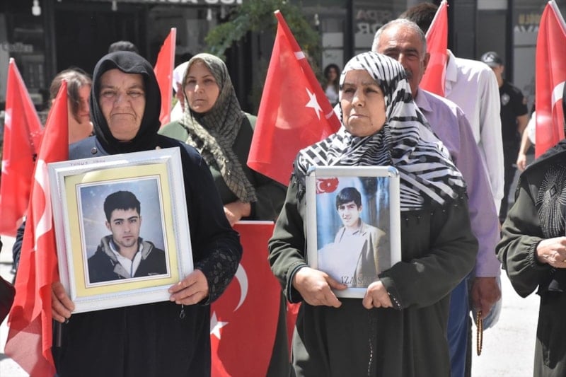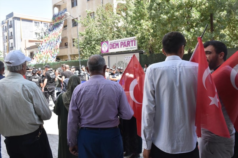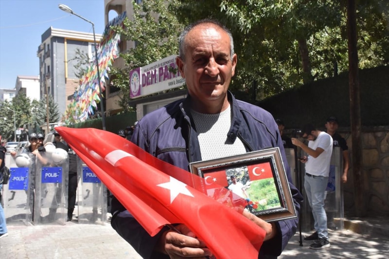 Van'da çocukları dağa kaçırılan aileler, DEM Parti İl Başkanlığı binası önündeki eylemlerine bu hafta da devam etti. Ellerinde Türk bayrakları ve evlatlarının fotoğraflarıyla yürüyen vatandaşlar, çocuklarına teslim ol çağrısında bulundu.