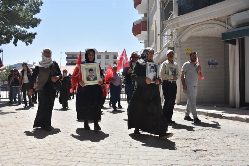 Menekşe Sokak'ta bir araya gelen aileler, Türk bayrakları ve evlatlarının fotoğraflarını taşıyarak, DEM Parti İl Başkanlığı binasının önüne kadar yürüdü.