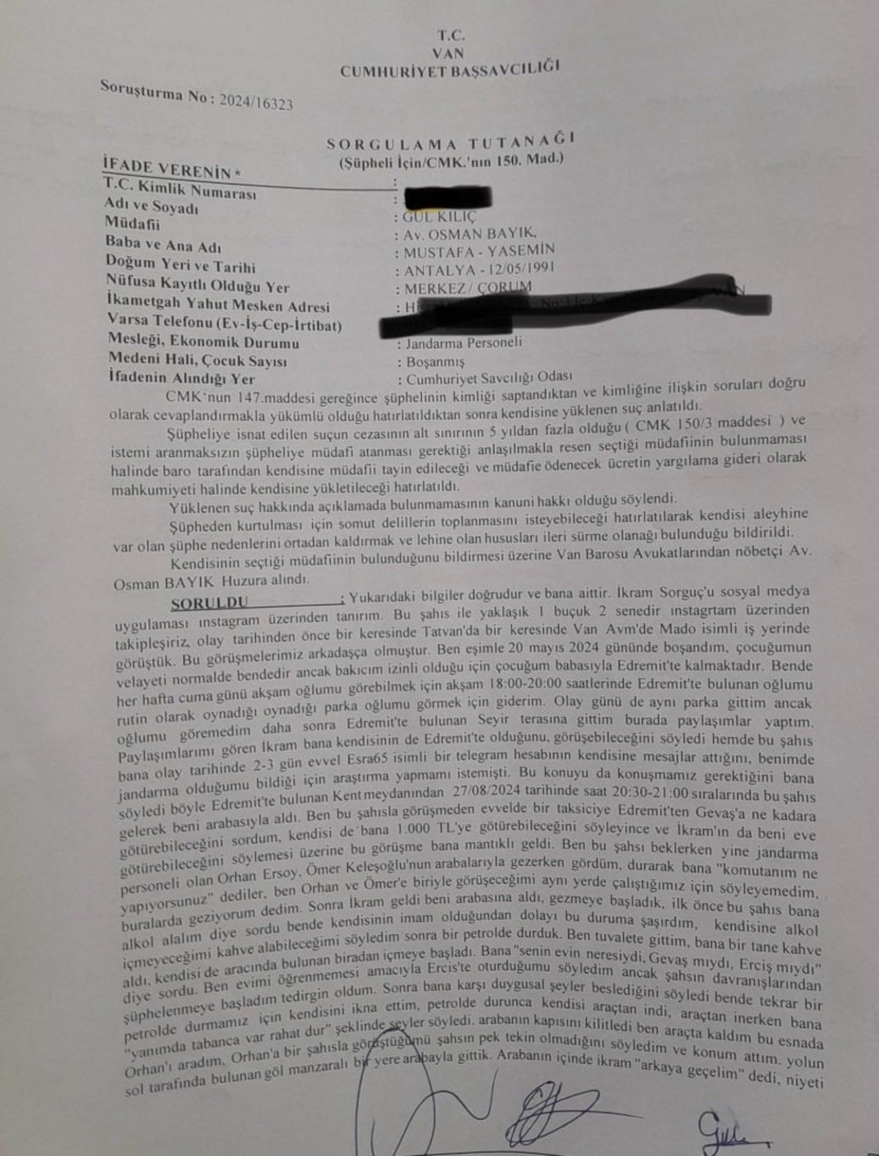 Hakkındaki iddiaları reddeden astsubay Gül K. ifadesinde imam İkram S. ile sosyal medya üzerinden iki yıldır görüştüğünü, bu süre içinde Van ve Tatvan’da toplam iki kez buluştuklarını söylüyor.