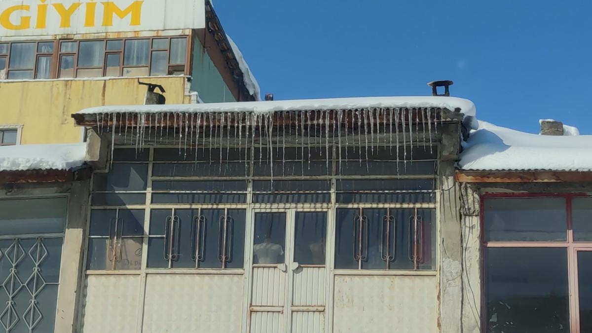 Kar yağışının ardından etkisini göstermeye başlayan dondurucu soğuklar nedeniyle çarşı merkezinde bulunan iş yerlerinin çatılarda yaklaşık 1.5 metrelik buz sarkıtları sarkmaya başladı.