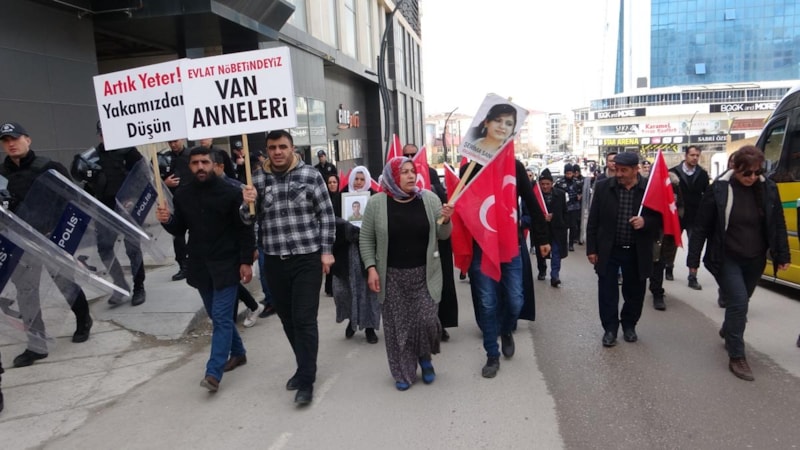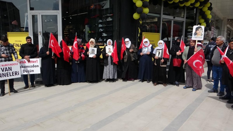 Sayıları 32'yi bulan aileler, Van'ın en işlek noktası olan Cumhuriyet Caddesi'nde bir araya geldi.