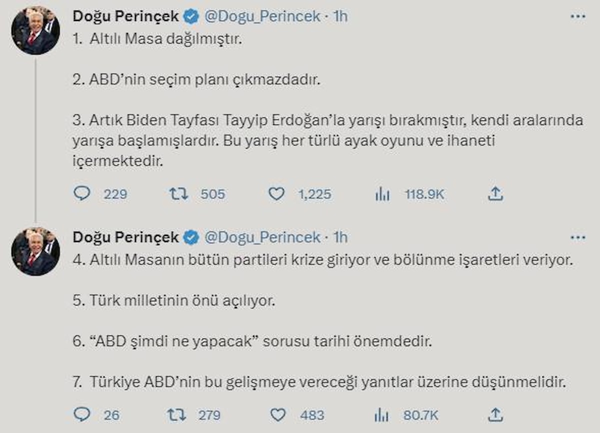 Altılı masanın bütün partilerinin krizde olduğunu ve bölünme işaretleri verdiğini söyleyen Perinçek, "Türk milletinin önü açılıyor." ifadesini kullandı. Perinçek, paylaşımının devamında şöyle dedi: