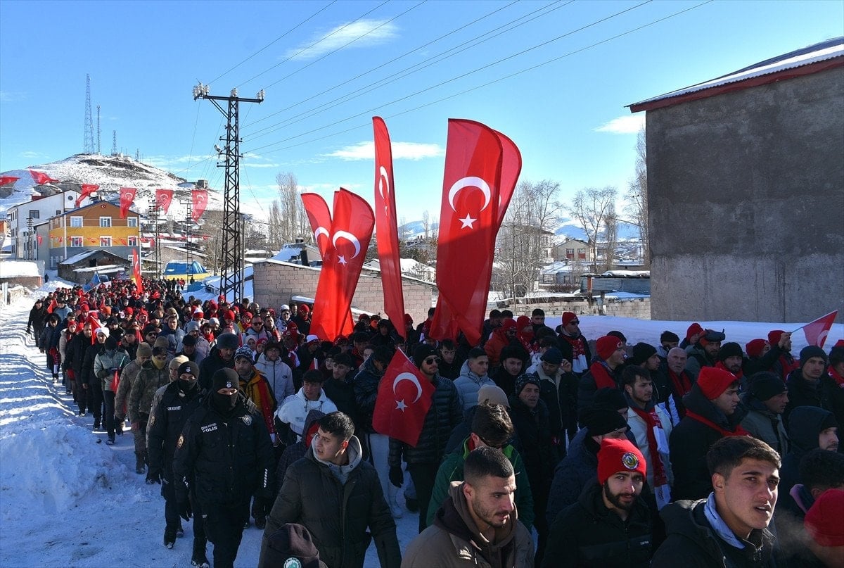 Kars'ın Sarıkamış ilçesinde binlerce kişi sabahın erken saatlerinde ellerinde Türk bayraklarıyla eksi 15 derece soğukta Sarıkamış şehitleri için yürüdü.