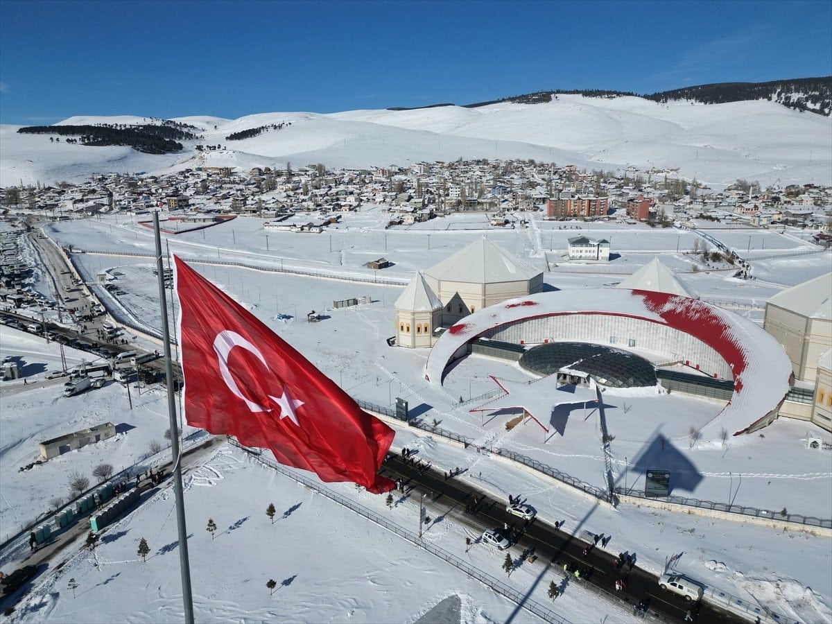 - Anma törenine katılanlar, -15 derece soğukta Türk bayrakları taşıyarak dualar eşliğinde tören alanına yürüdü.