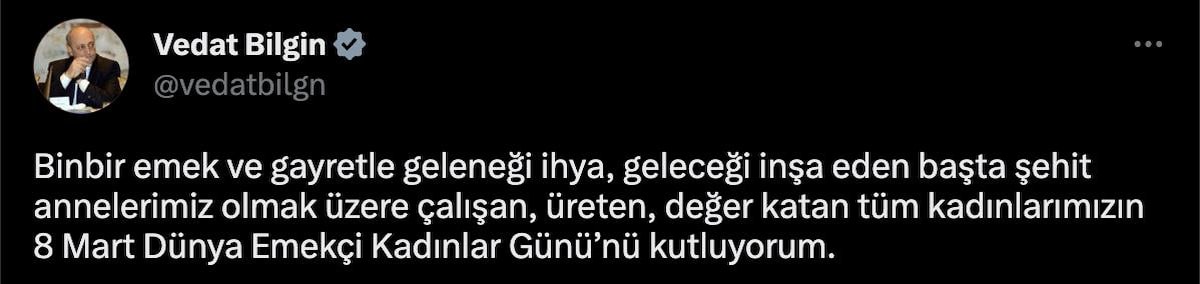 Son olarak Çalışma ve Sosyal Güvenlik Bakanı Vedat Bilgin, 8 Mart Dünya Emekçi Kadınlar Günü dolayısıyla sosyal medya hesabında paylaşımda bulundu.