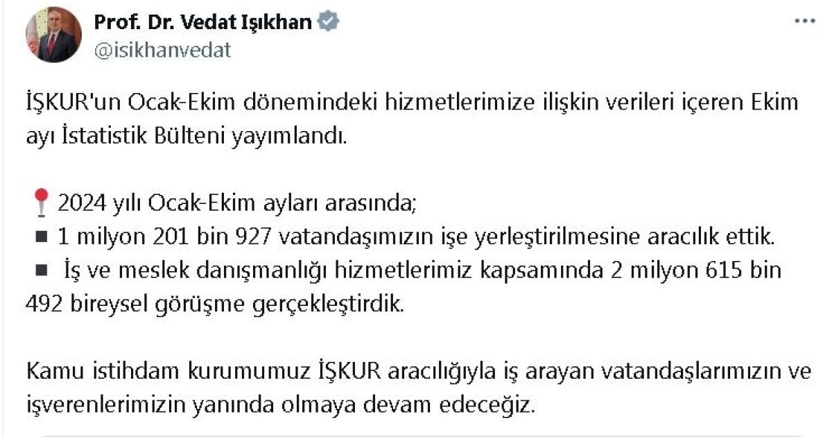 Paylaşımda, İŞKUR aracılığı ile 2024 yılı Ocak-Ekim ayları arasında 1 milyon 201 bin 927 vatandaşın işe yerleştirilmesine aracılık edildiği açıklandı.