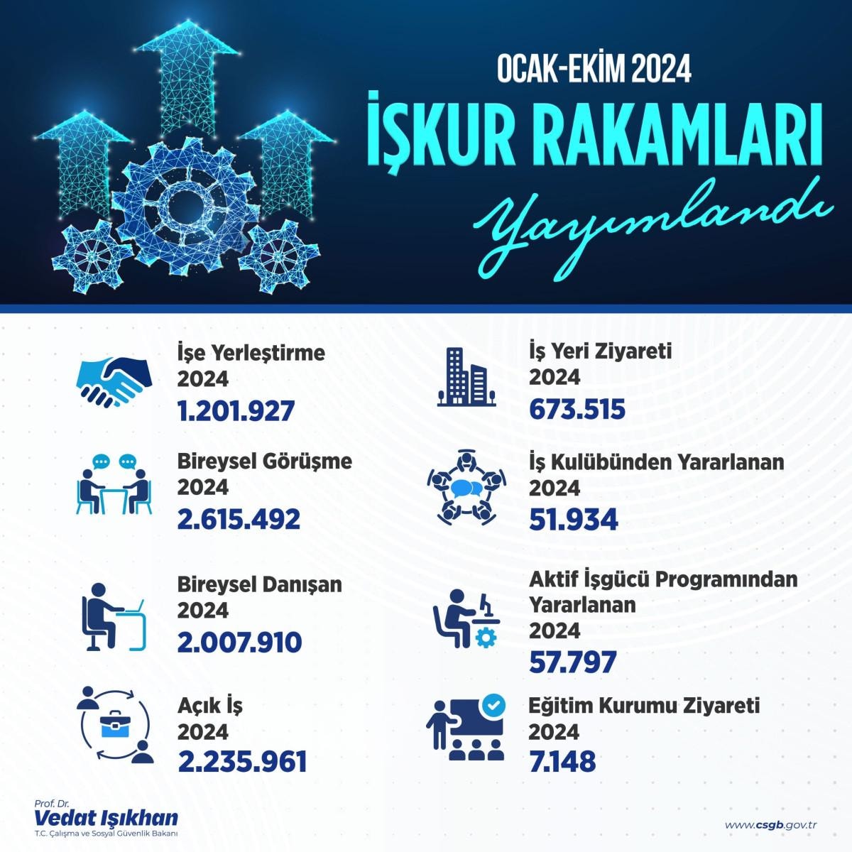 Çalışma ve Sosyal Güvenlik Bakanı Vedat Işıkhan, Türkiye İş Kurumu'nun (İŞKUR) 2024 yılı Ocak-Ekim ayları arasındaki verilerini sosyal medya hesabından paylaştı.