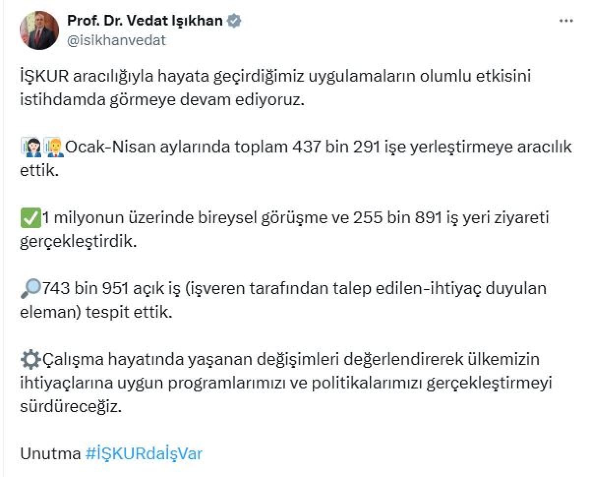 Çalışma ve Sosyal Güvenlik Bakanı Vedat Işıkhan, sosyal medya hesabından, ocak- nisan ayı işe yerleştirme verilerine ilişkin paylaşımda bulundu.