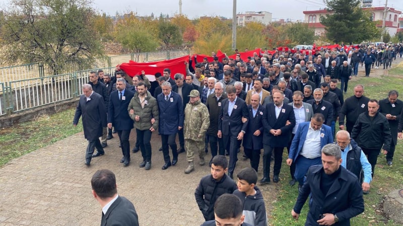 Vali Akkoyun ve beraberindekiler, 75 metre uzunluğundaki Türk bayrağı eşliğinde yaklaşık 500 metre mesafedeki mezarlığa yürüdü.