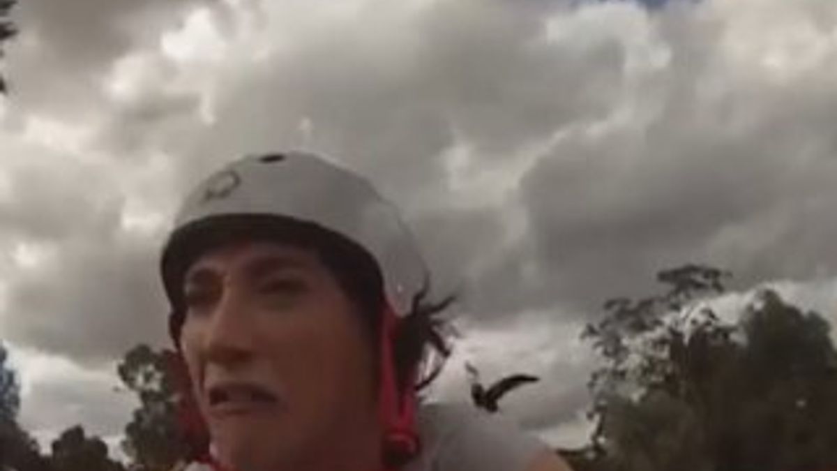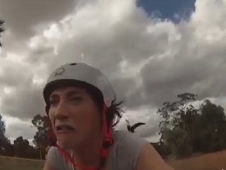 Kaskının arkasına çizdiği bir çift göz ile saksağanın saldırısını önleyebileceğini düşünen genç kadının planı başarısız olunca ortaya bu ilginç ve komik görüntüler çıktı.