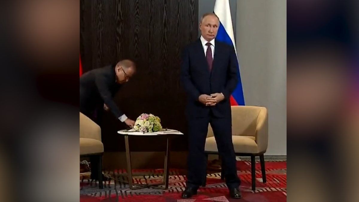 Putin, görüşmenin yapılacağı salonda Erdoğan'ı 1 dakika boyunca ayakta beklemesi dikkat çekdi.