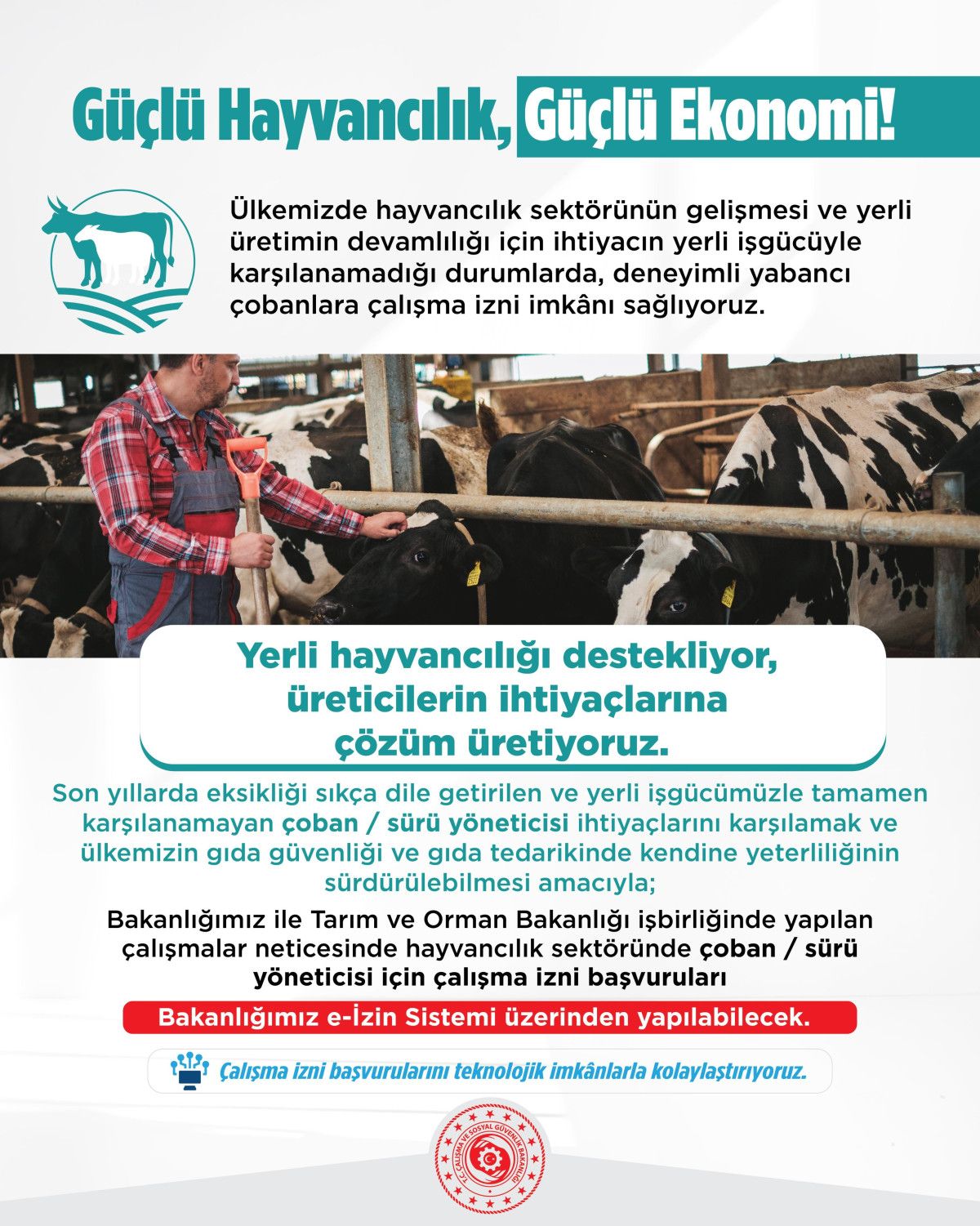 Bu kapsamda Tarım ve Orman Bakanlığı iş birliğinde hayvancılık sektöründe büyükbaş veya küçükbaşı bulunan ve 'Hayvan Bilgi Sistemi'ne kayıtlı hayvancılık işletmelerinde istihdam edilecek çobanlara ve hayvan bakıcılarına ilişkin çalışma izni başvurularının değerlendirilmesinde belirlenen kriterler kapsamında çalışma izni başvuruları 12.06.2025 tarihi itibarıyla alınmaya başlanmıştır.