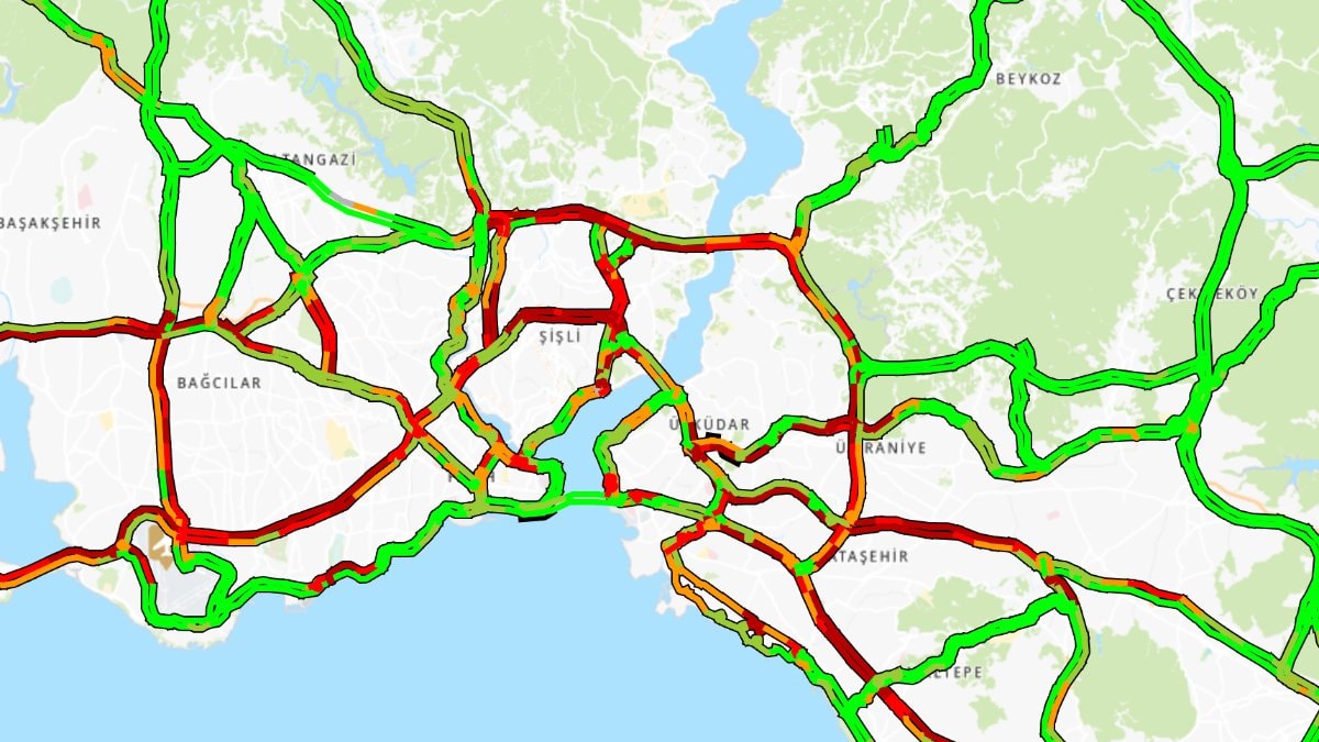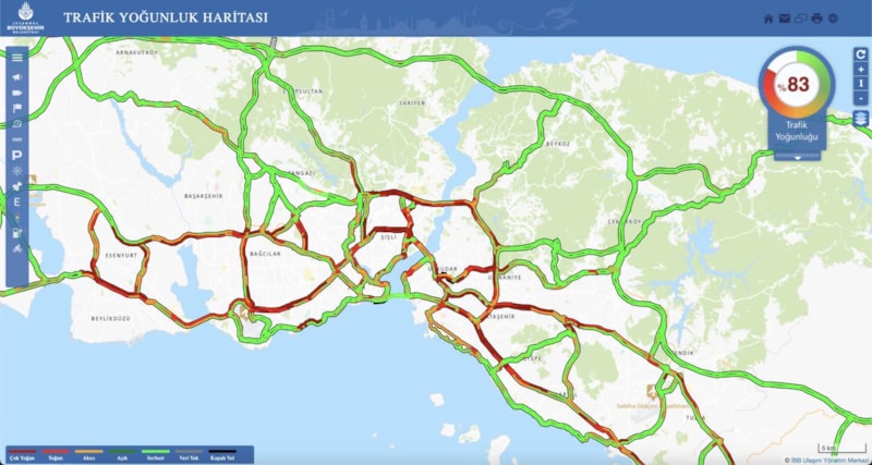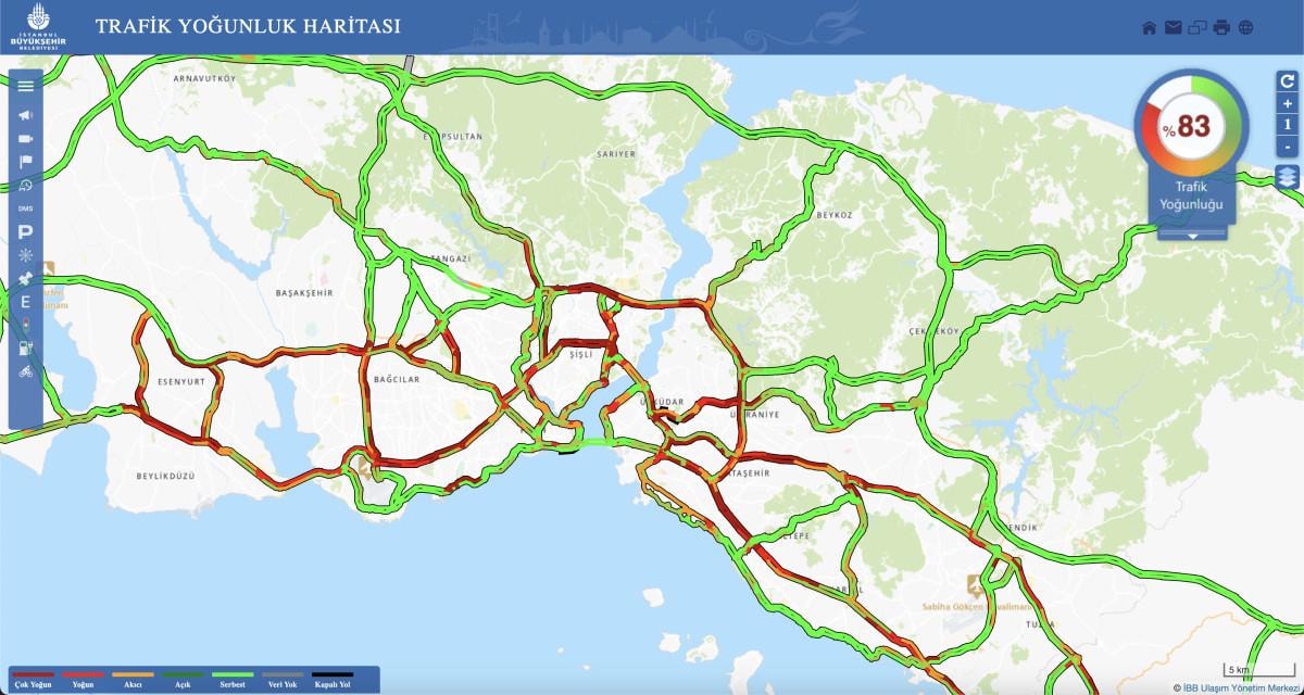 İstanbul Büyükşehir Belediyesi'nin (İBB) trafik yoğunluğu haritasına göre trafik, saat 17.50 itibarıyla yüzde 83 olarak ölçüldü.