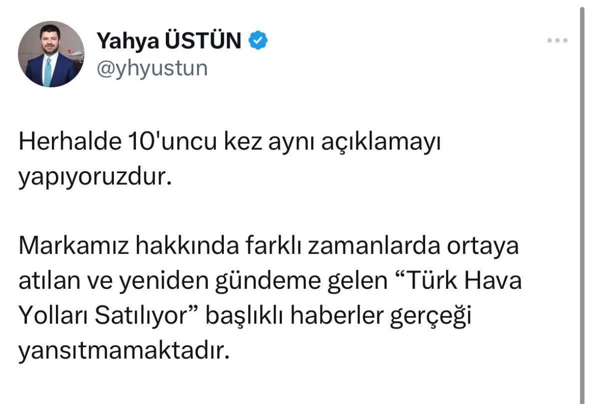 Üstün, Türk Hava Yolları'nın satılacağına ilişkin haberleri kesin dille yalanladı. Yahya Üstün, sosyal medya hesabından yaptığı açıklamada şu ifadeleri kullandı:
