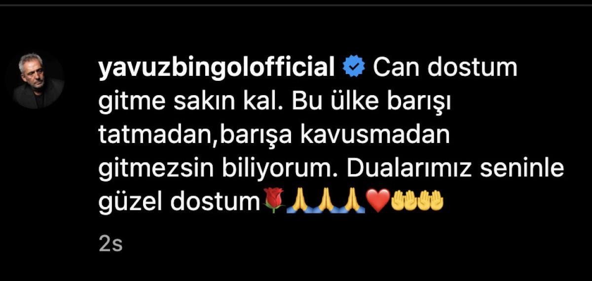 Can dostum gitme sakın, kal. Bu ülke barışı tatmadan, barışa kavuşmadan gitmezsin biliyorum. Dualarımız seninle güzel dostum.