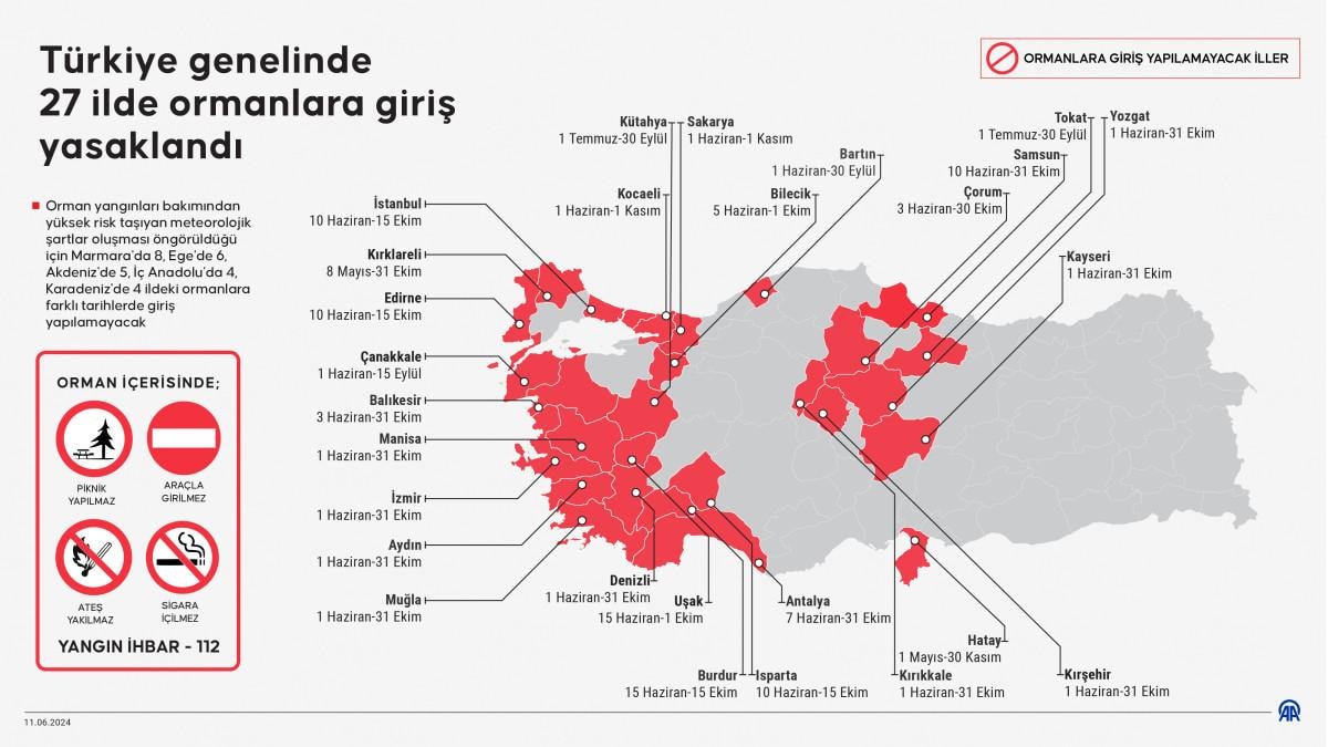 Türkiye genelinde 11 Haziran itibarıyla ormanlara girişin yasak olduğu iller ve tarihler şöyle:
