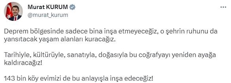 Deprem bölgesinde sadece bina inşa etmeyeceğiz, o şehrin ruhunu da yansıtacak yaşam alanları kuracağız. Tarihiyle, kültürüyle, sanatıyla, doğasıyla bu coğrafyayı yeniden ayağa kaldıracağız! 143 bin köy evimizi de bu anlayışla inşa edeceğiz.